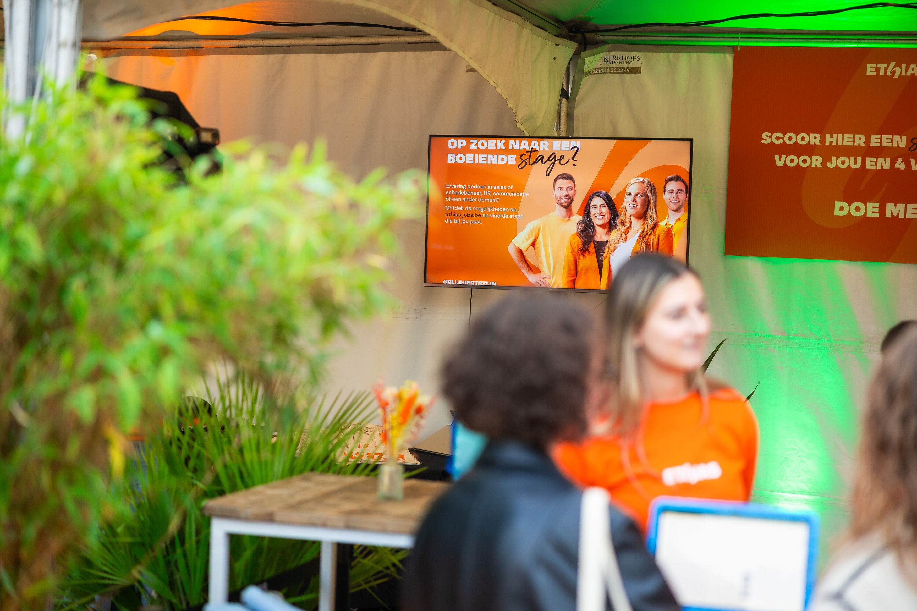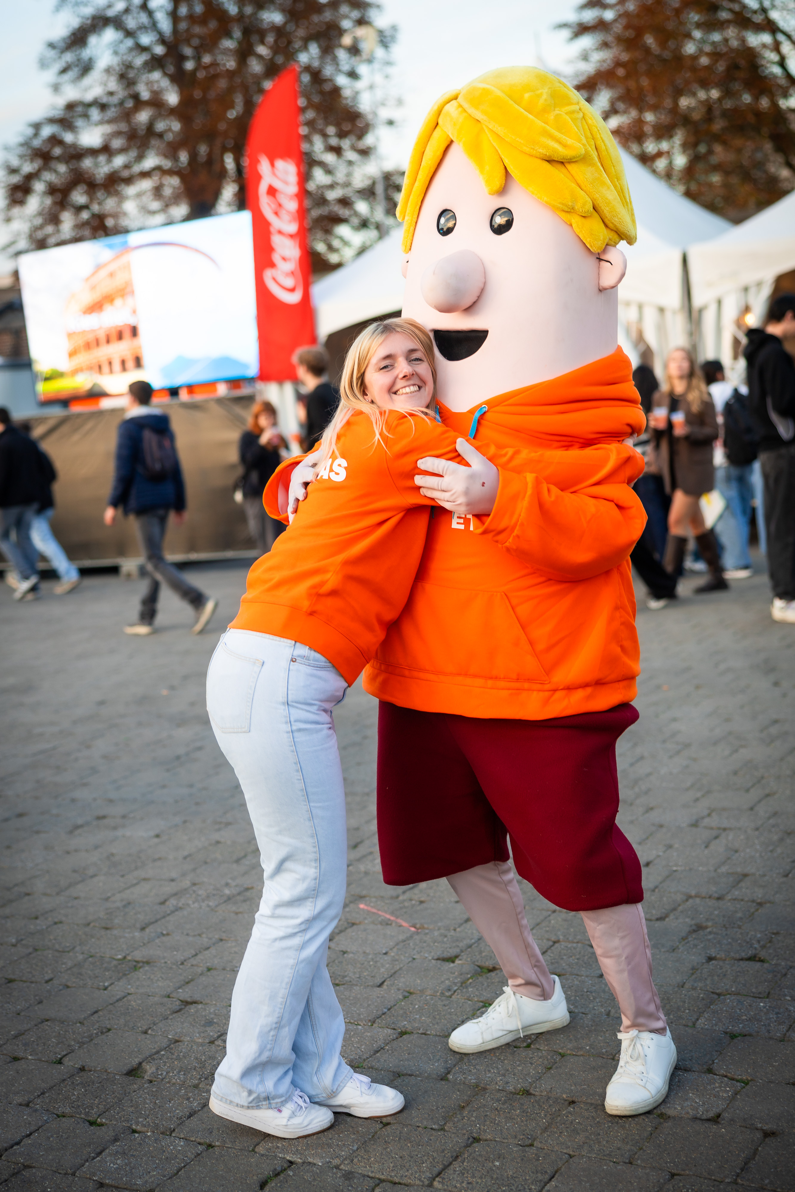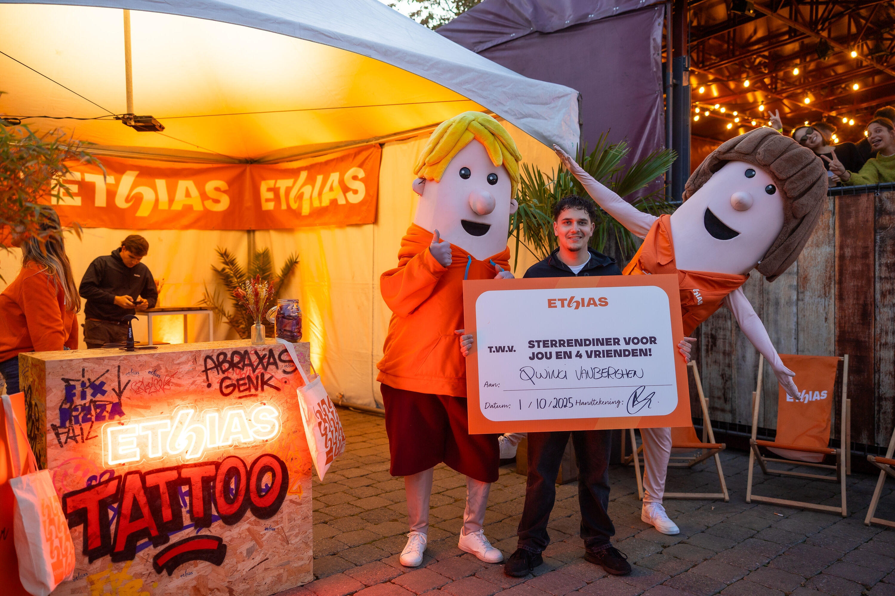 Op het Ethias-terras konden studenten daarna even ontsnappen aan de drukte. Opladen met een drankje, chillen in de zitzakken, of gewoon lachen met onze mascottes, die het terrein onveilig maakten met dansjes, selfies en stiekeme photobomb-acties. Tussendoor konden studenten ook kennismaken met onze Ethias Crew, die op een spontane, toegankelijke manier alles vertelde over hoe Ethias studenten helpt veilig en zorgeloos het academiejaar door te gaan.